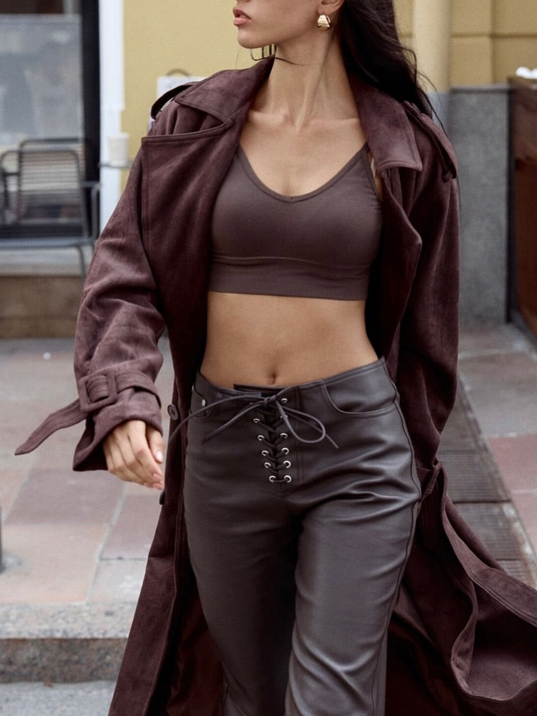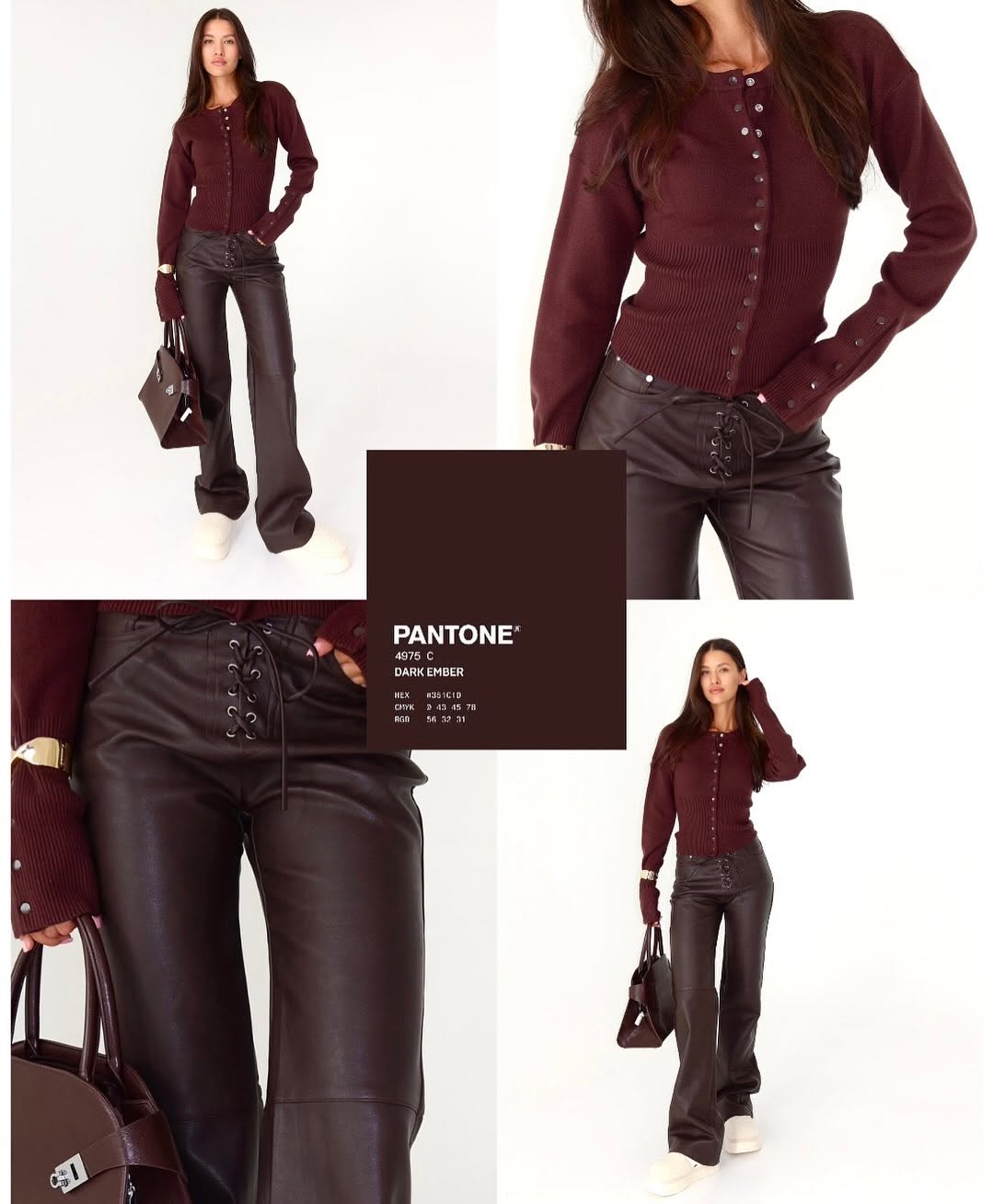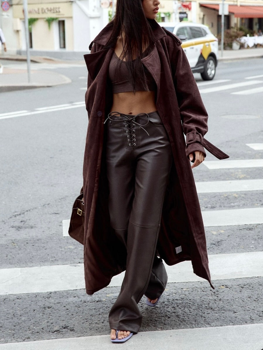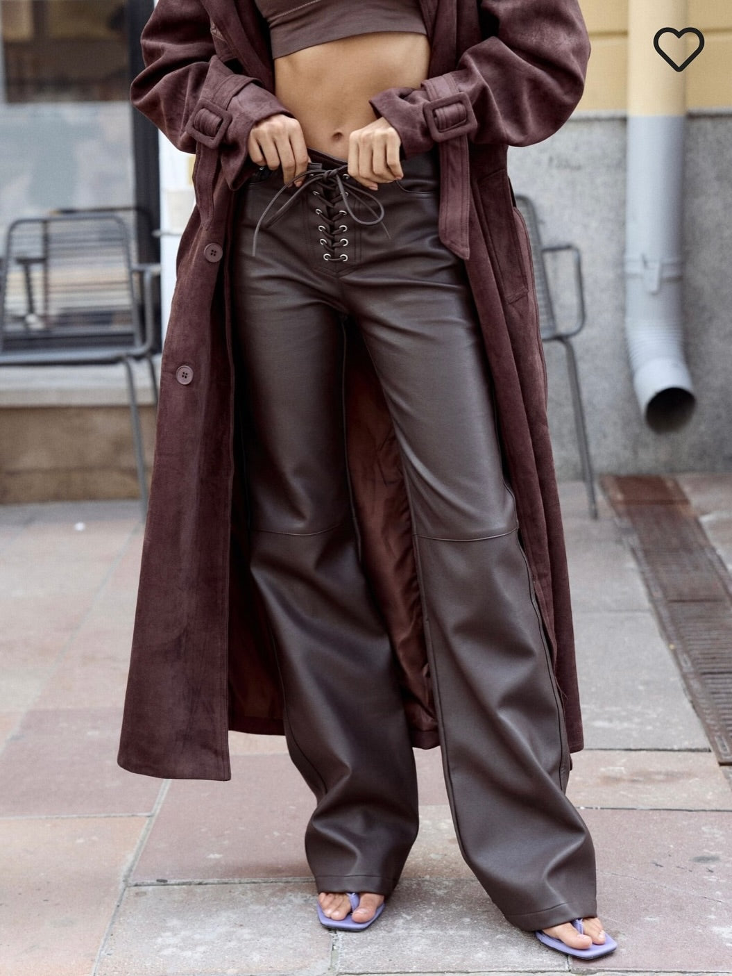 Pantalonii din piele ecologică cu șireturi aduc un aer rafinat și modern oricărei ținute. Croiala dreaptă, lejeră, combinată cu detaliul frontal tip corset, evidențiază talia și adaugă o notă subtilă de senzualitate. Finisajul lucios și textura moale oferă un aspect elegant, dar confortabil.