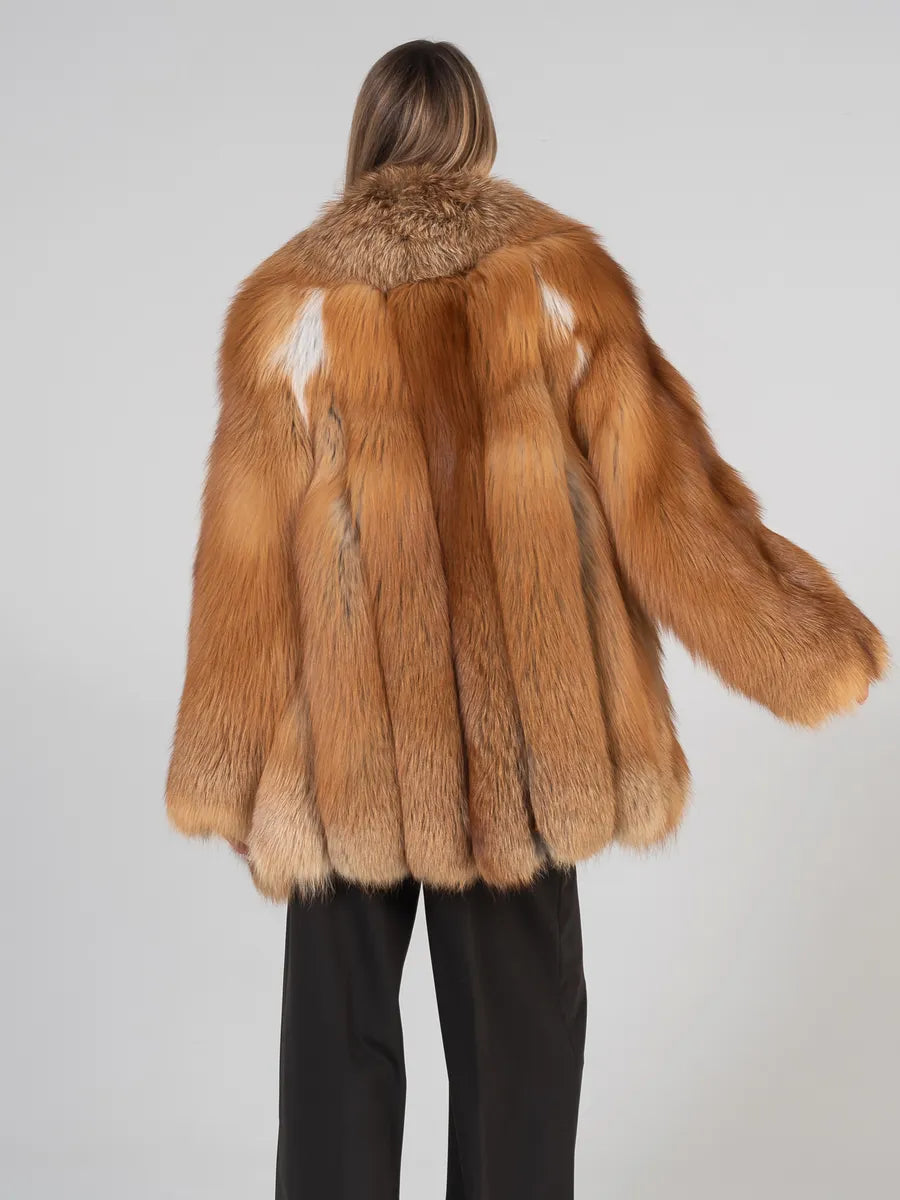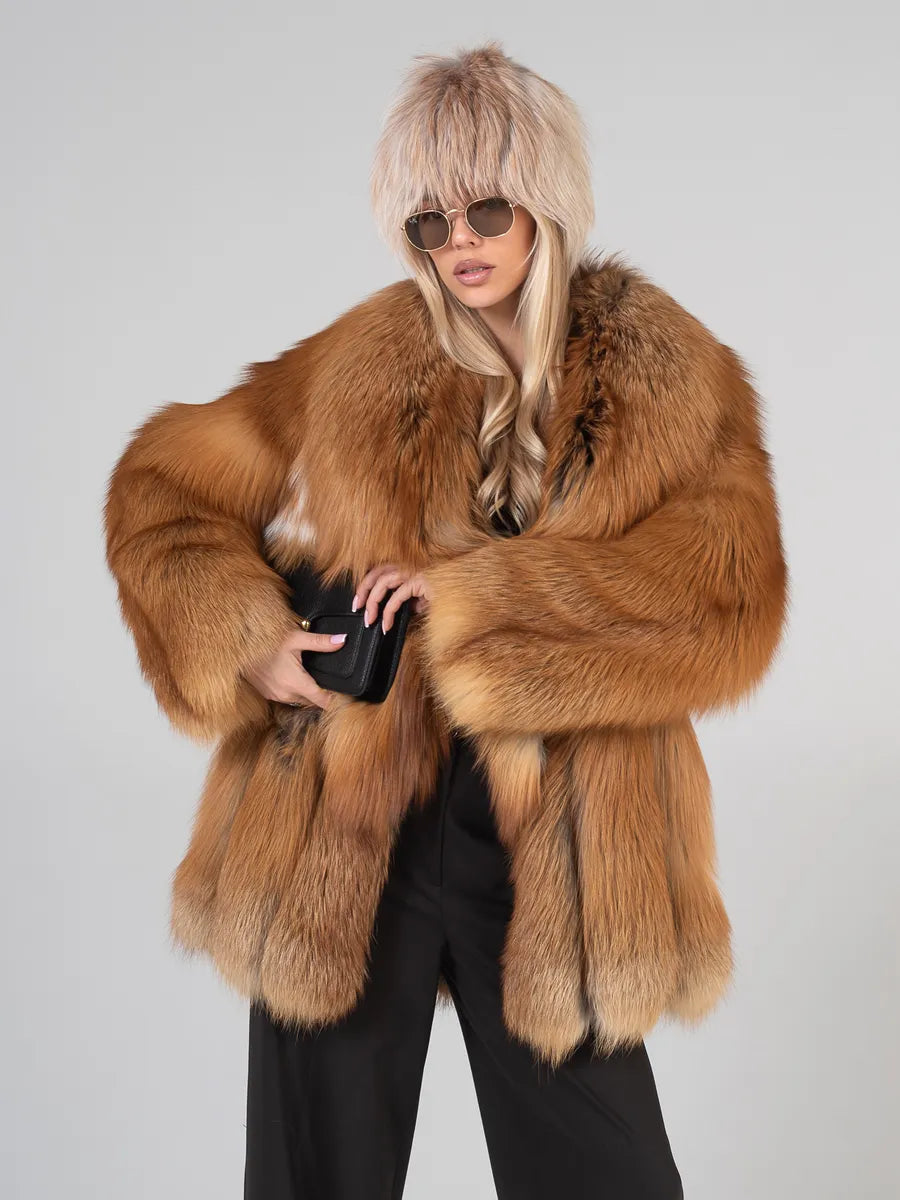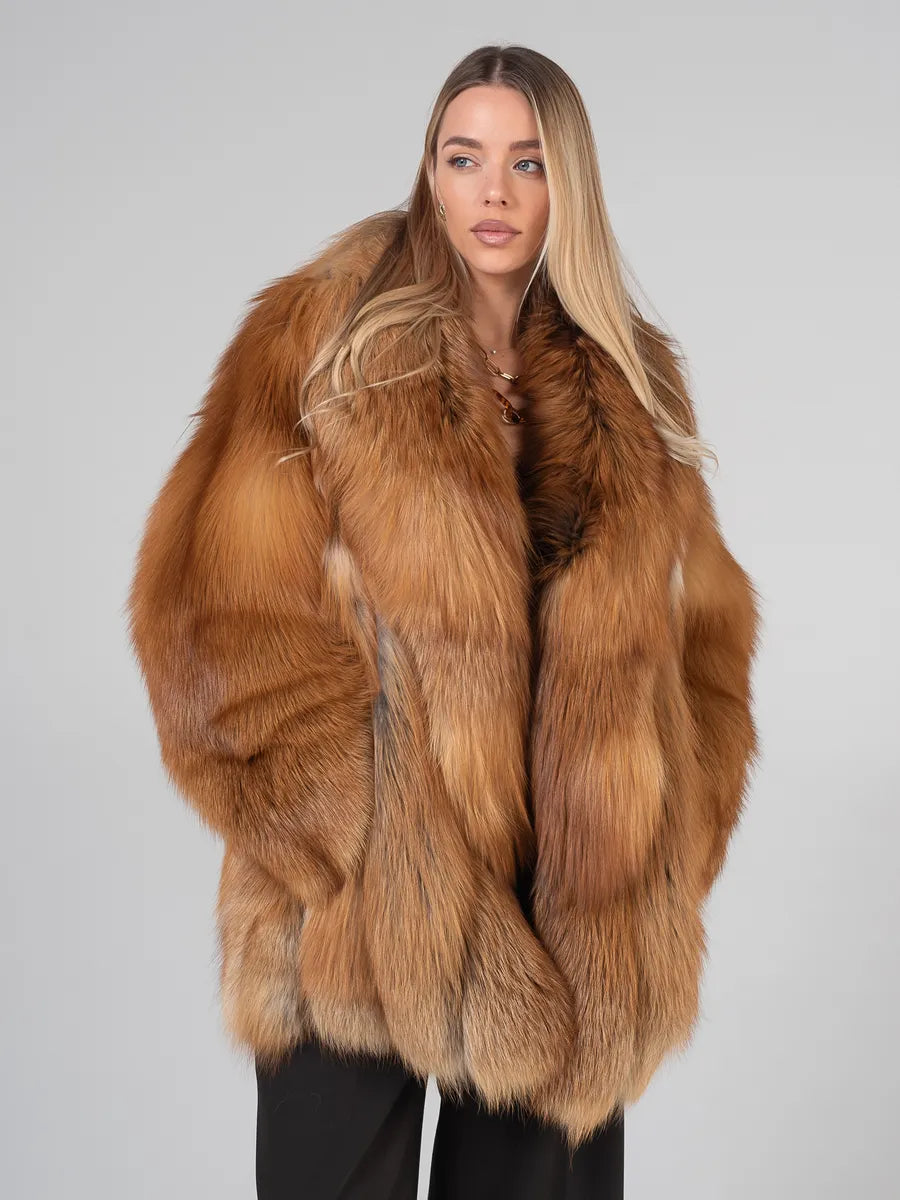 Elena este o piesă spectaculoasă, creată pentru femeia care iubește luxul autentic și eleganța naturală. Realizată din blană naturală de vulpe de foc, această haină impresionează prin nuanțele sale calde de arămiu, roșcat și auriu, ce oferă un efect vizual bogat și rafinat. Croiala amplă și textura densă a blănii creează o siluetă elegantă și sofisticată, potrivită atât pentru ținute casual-chic, cât și pentru apariții de seară.