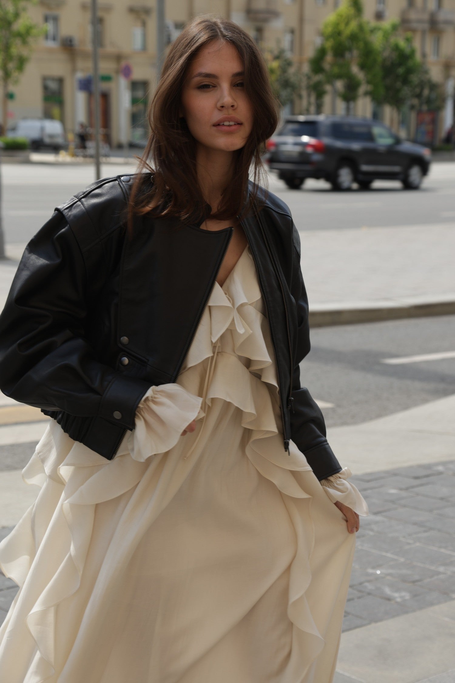 • Stil: se potrivește atât cu rochii vaporoase pentru contrast feminin, cât și cu blugi sau pantaloni din piele pentru un look urban